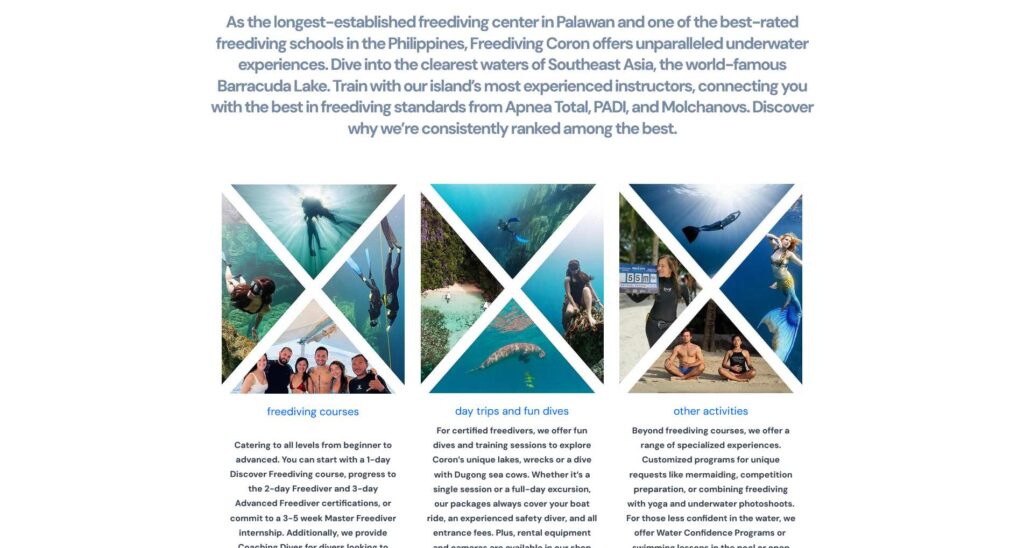 The area, most notably Coron, Palawan, Philippines, is an exceptional choice for freediving and snorkeling due to a combination of unique geographical features and rich marine life.